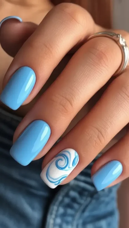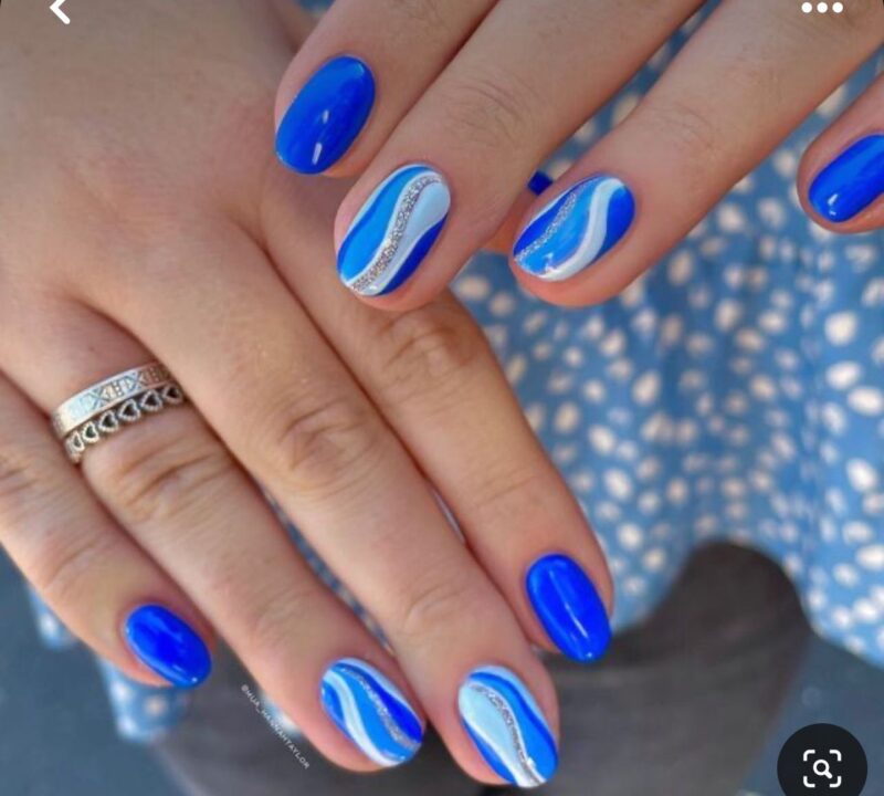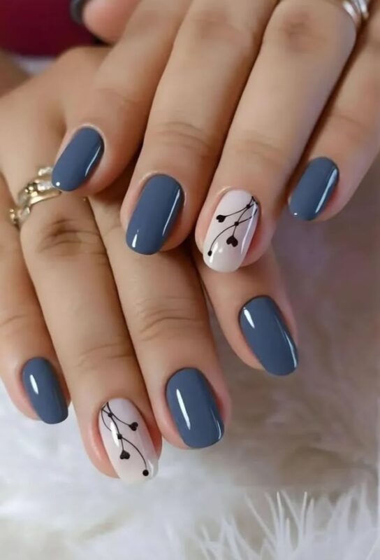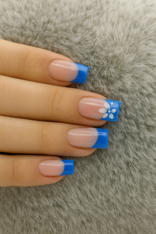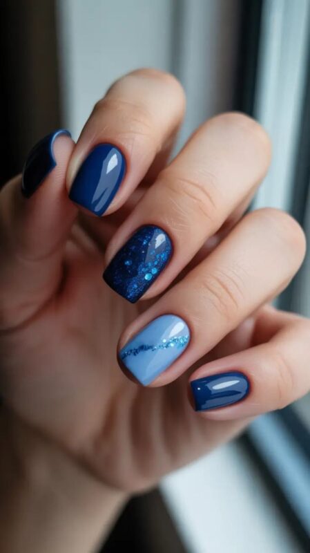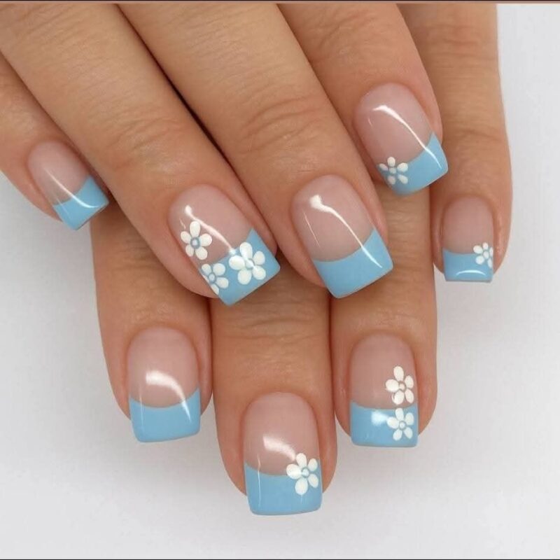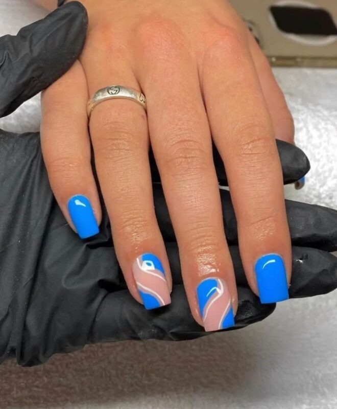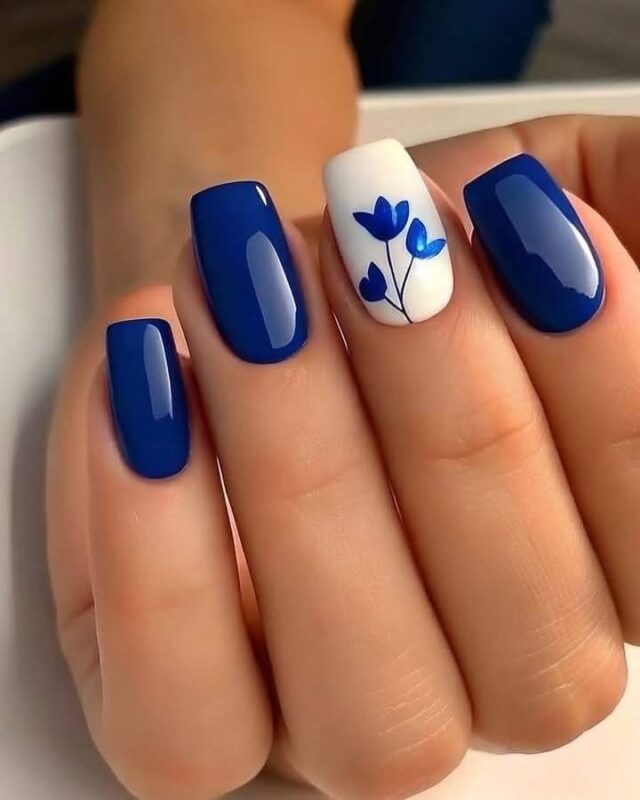 Simple nail art can make blue short nails even more attractive. Thin French tips, tiny white flowers, light swirl details, small silver accents, or one glossy accent nail can add charm without making the design look crowded. A glossy top coat helps blue shades look smoother and cleaner, while a soft matte finish gives the nails a more subtle feel.