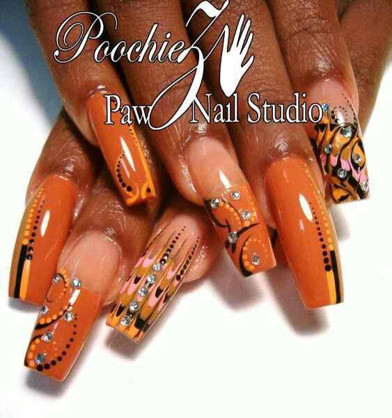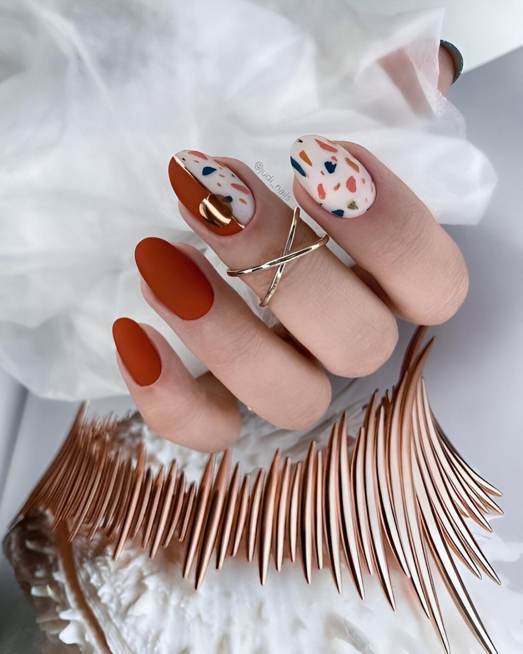 - Design: Orange nails with copper metallic stripes or geometric patterns.