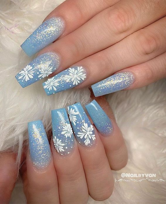 1. Icy Blue Winter Wonderland: Embrace the essence of winter with icy blue nails. Opt for a light, shimmery blue and consider adding snowflake designs or a frosty ombre effect for a magical touch.
