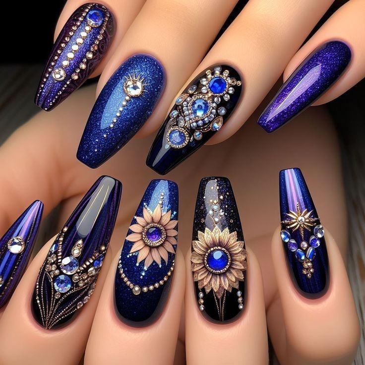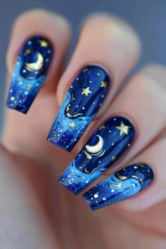 Let your nails explore the universe with designs that reflect the beauty of a galaxy far, far away. These celestial nail designs range from bright lightning bolt accents to twinkling stars and deep cosmic blues, capturing the mystique of the cosmos. The striking combinations of pink, turquoise, and blue gradients with metallic details mirror a starry night sky, creating a mesmerizing effect. Glittering gems, celestial motifs, and intricate designs add a touch of elegance, making your nails feel like a canvas painted with the wonders of the galaxy. Whether you’re reaching for a futuristic neon look or a delicate moonlit evening design, these nails are your perfect accessory to stand out and shine like the stars.